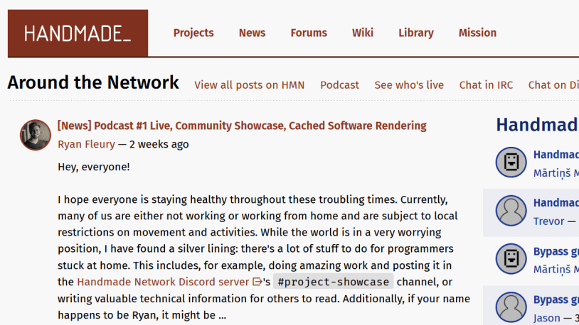 The reception I have received since joining the Handmade Network community has been incredible. Handmade Network lacks the elitism or snobbishness I’ve seen in some development circles. Veterans of the community answer day 1 questions from new members or guests with the same respect and enthusiasm that they treat each other with. It’s kind of interesting because you would think folks that are doing things purposefully harder and putting invisible restrictions on themselves would feel a certain superiority. The opposite couldn’t be more true.
