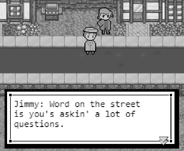Overall it was a super cool experience. I was lucky to have a great team; they produced super quality assets to work with and were great at communicating and providing feedback. I wish there had been more time to implement all of the ideas, there was just too much to do in such a short amount of time. I guess that’s the nature of game jams though. I also wrote the game’s systems from scratch and that detracted a lot of time as well. Unfortunately with four hours to go and tons to do, I had to strip virtually every idea out of the game to get something shipped, so you basically get a cut-scene, and then walk around the neighborhood and talk to the various characters Ansley created. Fortunately I feel like our team was on the same page and the game, the art, and the music fit well together. Here are some stills from the game: