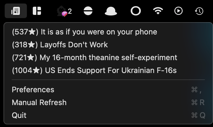 HackerNewsIcon – A macOS menu bar app I wrote that monitors Hacker News for top posts. Displays trending articles and notifies you when a new post reaches your set score threshold: