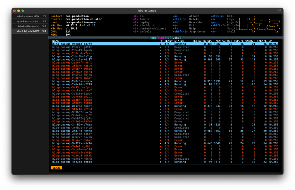 k9s – k9s is a TUI interface for managing a kubernetes cluster. This thing is invaluable and every day I pay homage to my colleague Chad or teaching me about it. I used to use Lens, but then they wanted money so I converted and haven’t looked back: