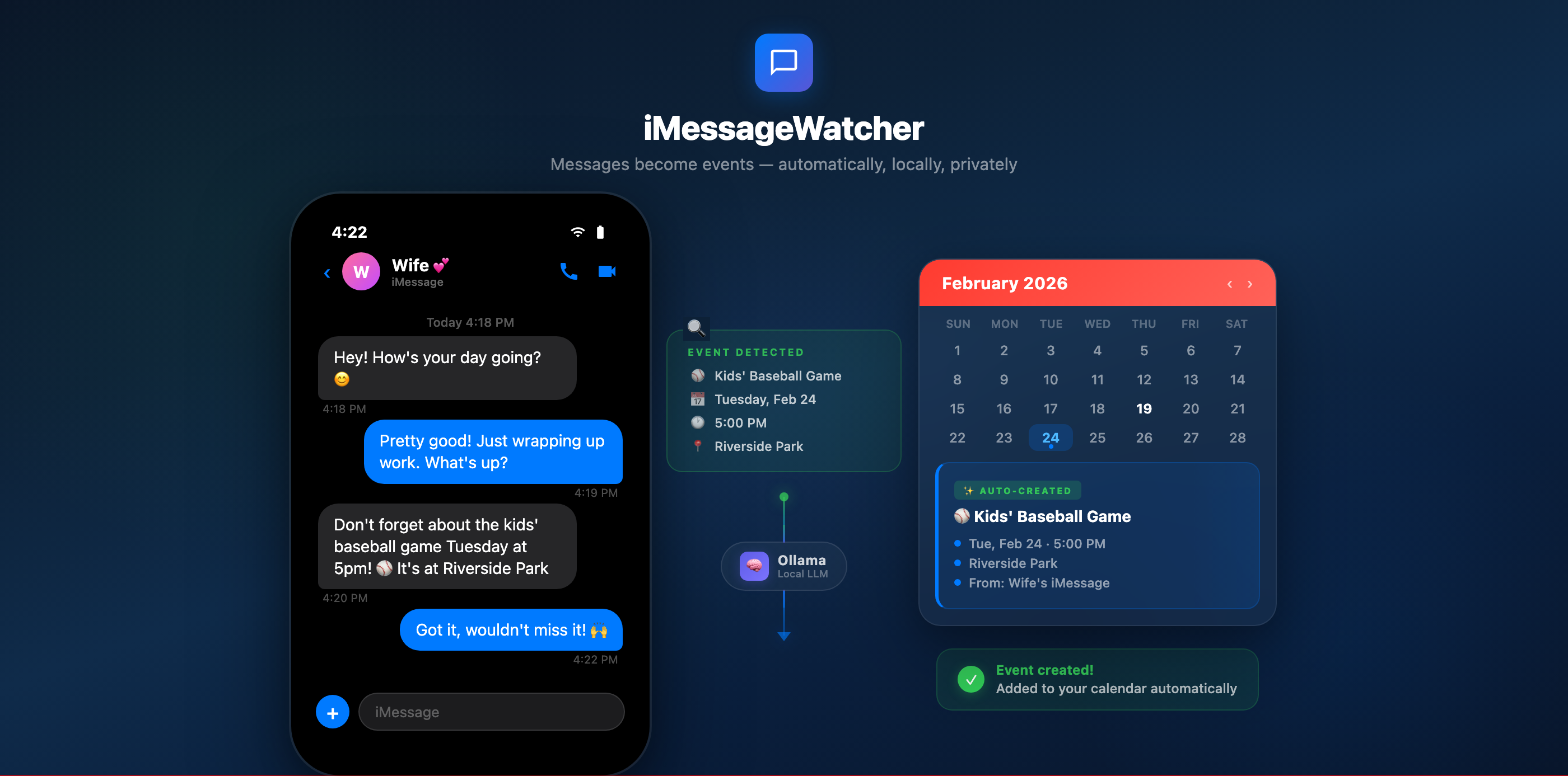 iMessageWatcher is a macOS menu bar app that watches my iMessages specifically from my wife and uses a local LLM to figure out if a message contains an event, a date, a reminder, or something I need to act on. If it does, the app automatically creates a calendar event with the name, location, time, and all that. No input from me. No copy-pasting. No “I’ll add that later” (which means never).